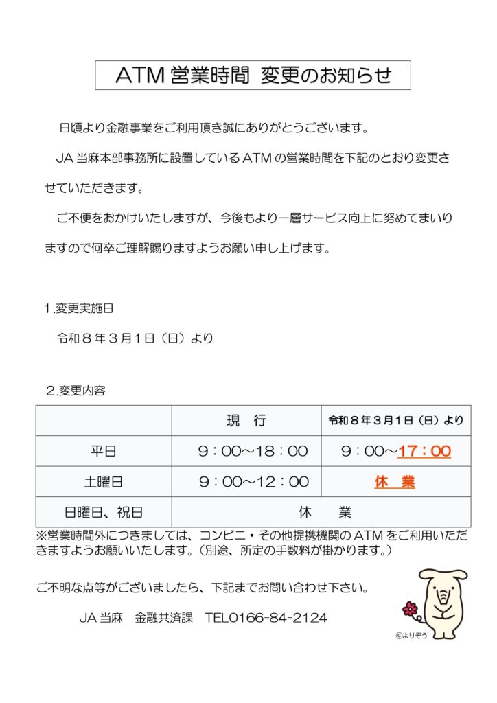 JA当麻本部事務所に設置しておりますATMの営業時間を令和8年3月1日より下記の通り変更させていただきます。